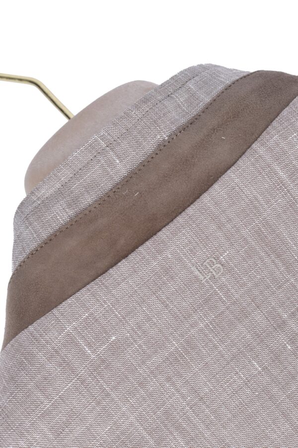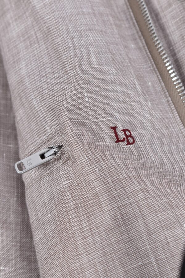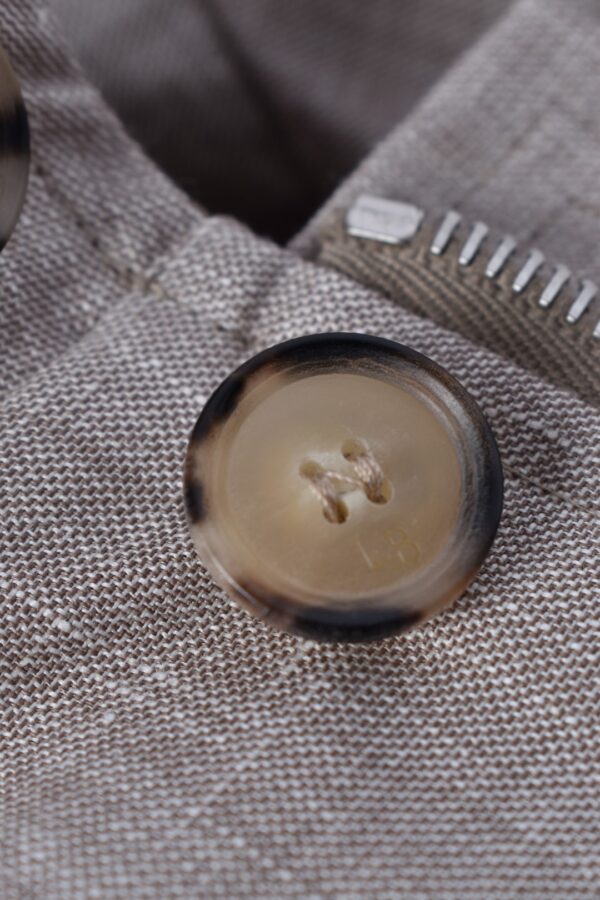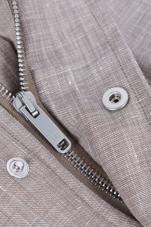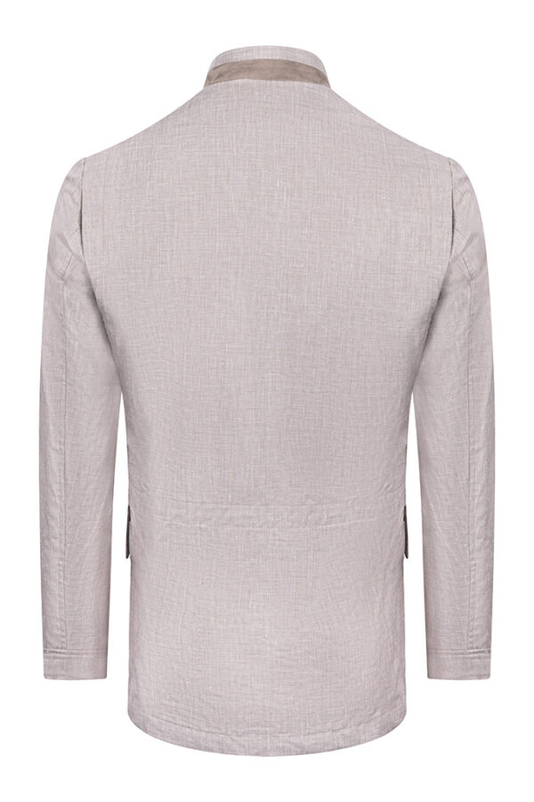 50% linen 45% wool 5% silk Tailored fit Press button and zip closure Patch pockets with flap Vertical chest pocket with zip Color beige